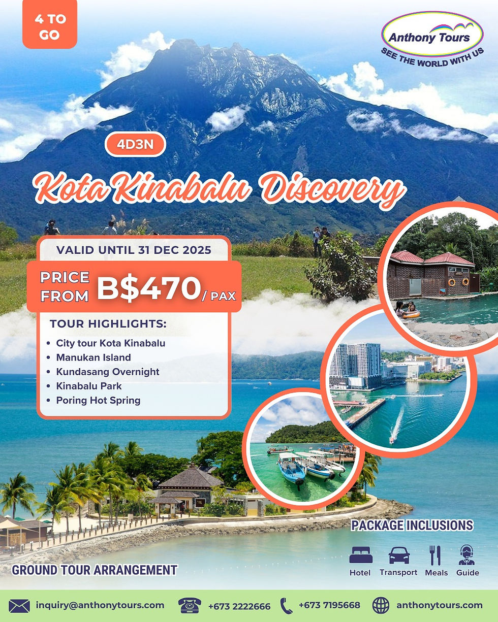 Arrival below the wind of Sabah with warmest welcome by tour guide and proceed City Tour. After tour, Transfer to Hotel free and leisure
